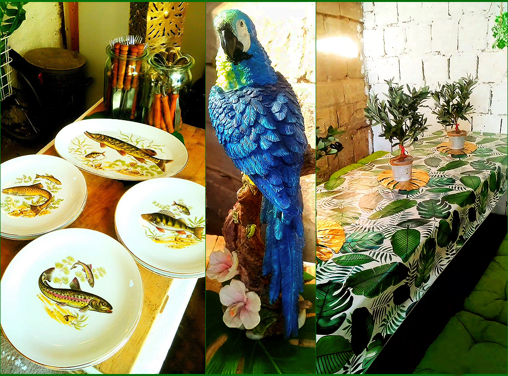 Geschirr und Besteck, sowie kleine Buffettische zum